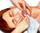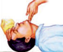 - odgięcie głowy do tyłu poprzez uniesienie palcami brody i lekki ucisk dłonią na czoło.