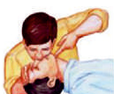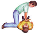 - kciukiem i palcem wskazującym ręki leżącej na czole zaciska nos poszkodowanego.